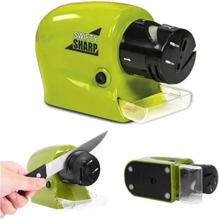 Ascuțitor electric pentru cuțite, foarfece și alte accesorii de bucătărie, ideal pentru utilizare diversificată. Dispozitivul Swifty Sharp, dotat cu funcții multiple, poate fi folosit pentru ascuțirea rapidă a cuțitelor și foarfecelor. Are o piatră de șlefuit specială care redă marginea tăioasă în câteva secunde. Include o tavă pentru colectarea resturilor metalice, facilitând curățarea. Funcționează cu 4 baterii R6 – AA (neincluse).