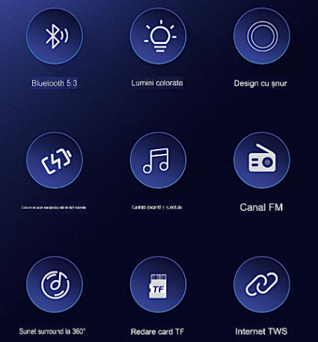 8. Control intuitiv, cu butoane accesibile pentru gestionarea volumului, schimbarea melodiei și activarea efectelor LED.