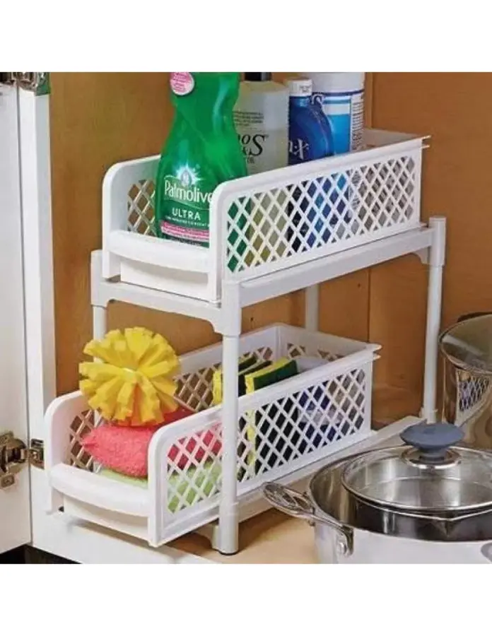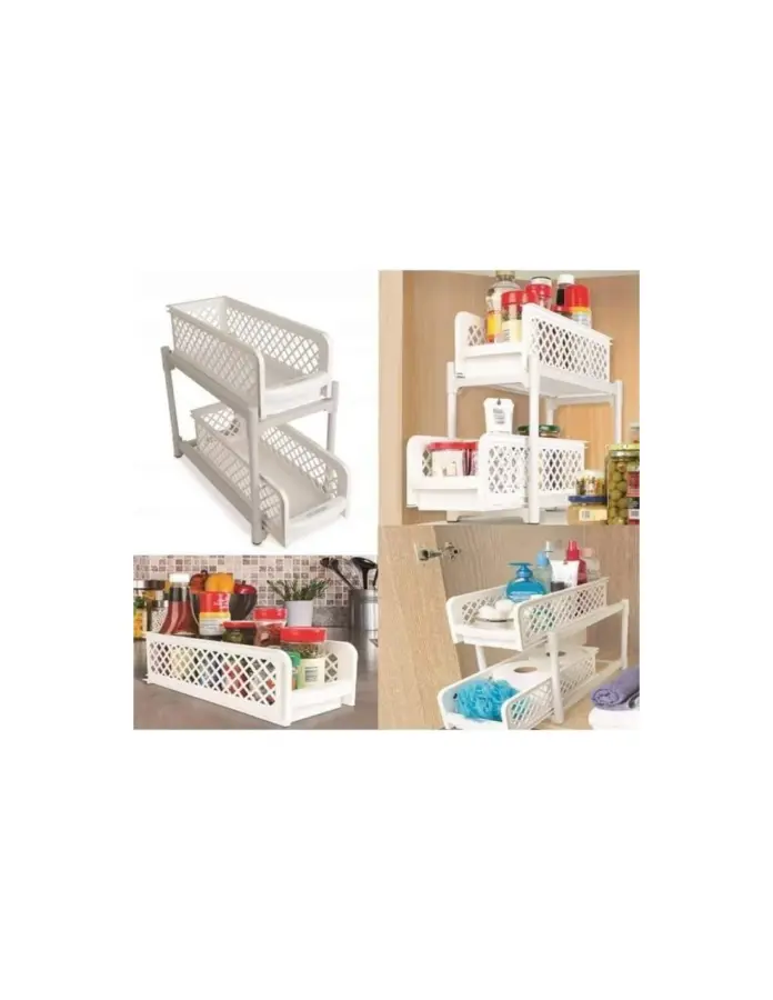 Etajera mica, cu doua rafturi culisante, potrivita pentru organizare si depozitare in bucatarie si baie. Oriunde o veti folosi, veti obtine spatiu suplimentar pentru depozitare. Fiecare sertar gliseaza in afara, ceea ce asigura accesul usor la articolele depozitate. Designul permite vizualizarea continutului din rafturi.