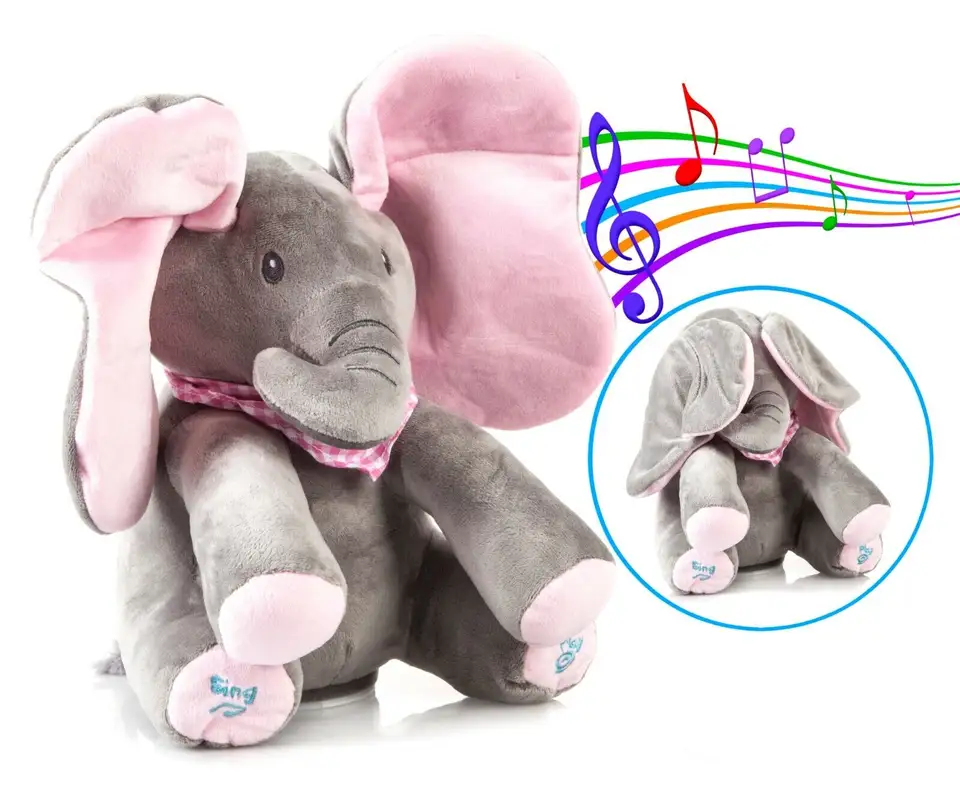 Elefant de pluș adorabil cu două moduri de joc. Apasă piciorul stâng pentru un joc de peek-a-boo și dreptul pentru a auzi melodia „Fa-ți urechile să stea jos”. Urechile se mișcă în timpul jocului. Melodii: Peek-a-Boo și melodii vesele. Se curăță ușor la suprafață. Potrivit pentru toate vârstele. Necesită 3 baterii AA. Dimensiuni: 20 x 15 x 15 cm.