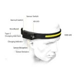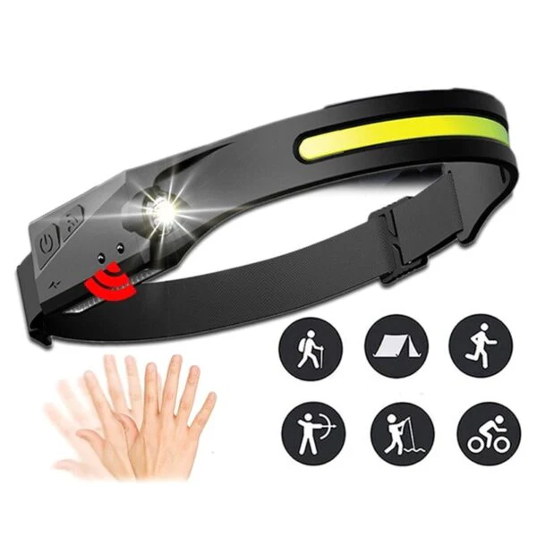 Această lanternă frontală este ideală pentru activități precum pescuit, camping și drumeții. Dispune de senzor de mișcare și este rezistentă la apă, având benzi cu LED-uri COB și XPE. Este echipată cu o curea rezistentă și extensibilă, oferind 5 moduri de iluminare.