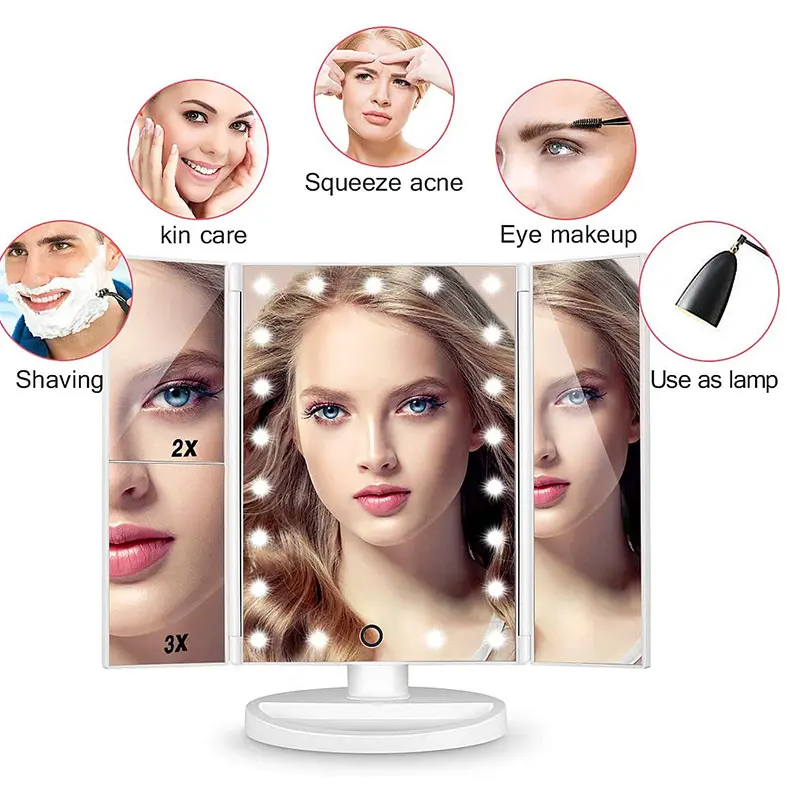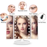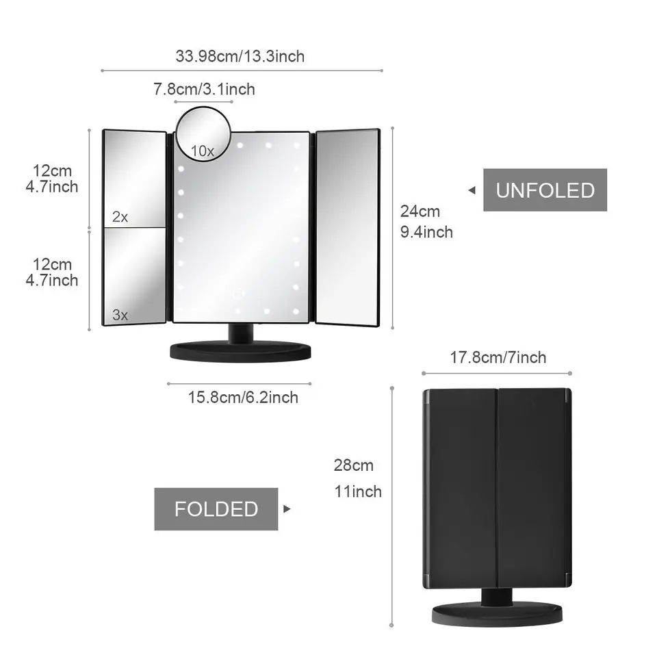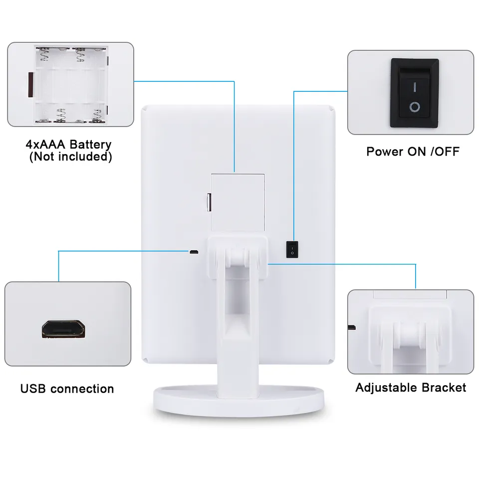 Fabricată din plastic de calitate superioară, oglinda dispune de 24 de lumini LED cu lumină albă, control tactil și poate fi rotită la 180 de grade.