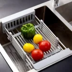 Suport de scurgere extensibil pentru chiuveta de bucătărie, fabricat din oțel inoxidabil, cu sită și organizator de depozitare.