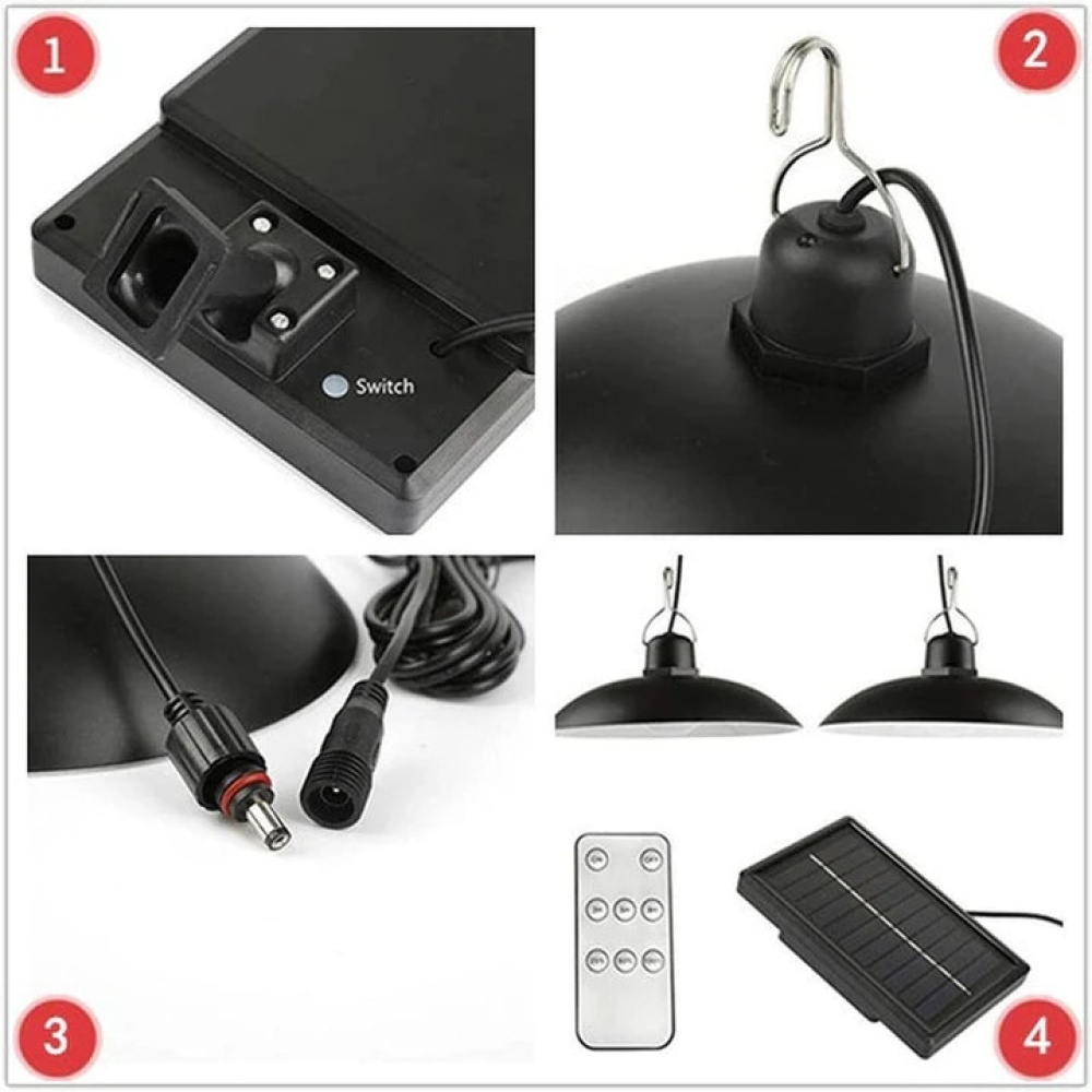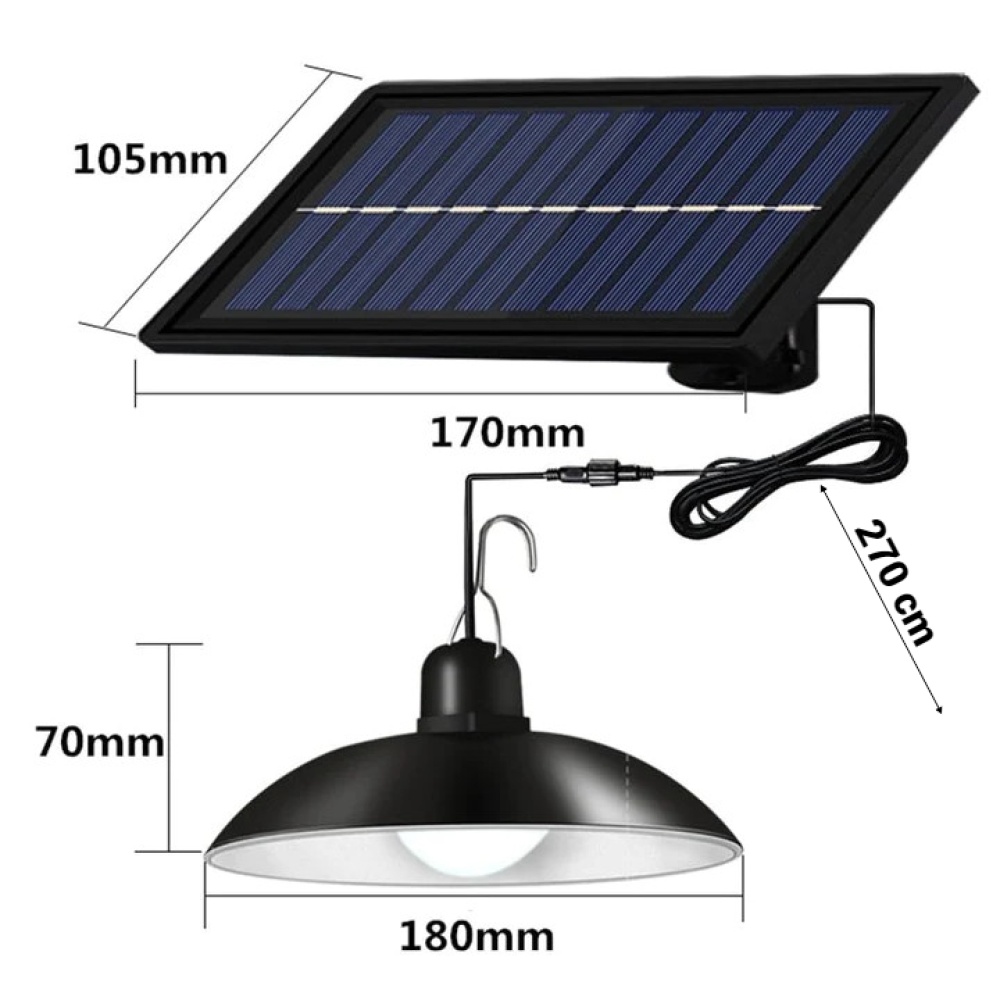 Panoul solar (170×105 mm) și abajurul metalic (180×70 mm) sunt durabile și rezistente, iar lungimea cablului dintre lampă și panou este de 3 metri. Potrivit pentru utilizare în toate anotimpurile, fiind alimentat de lumina naturală.
