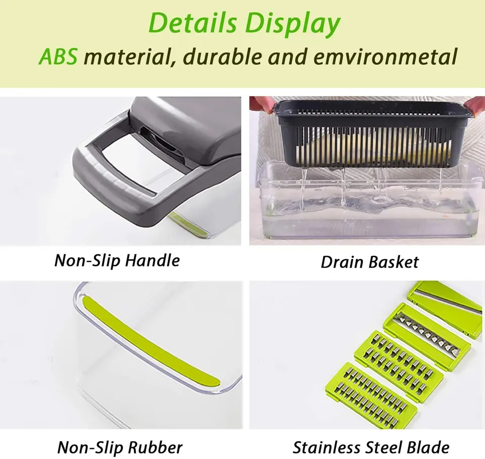 Răzătoarea multifuncțională pentru legume cu 7 lame din inox este ideală pentru tăierea precisă, mărunțire, tocare și răzuire. Include un recipient antialunecare și o protecție pentru mână. Setul de 7 accesorii poate fi utilizat și pentru depozitarea alimentelor în frigider, datorită capacului etanș.