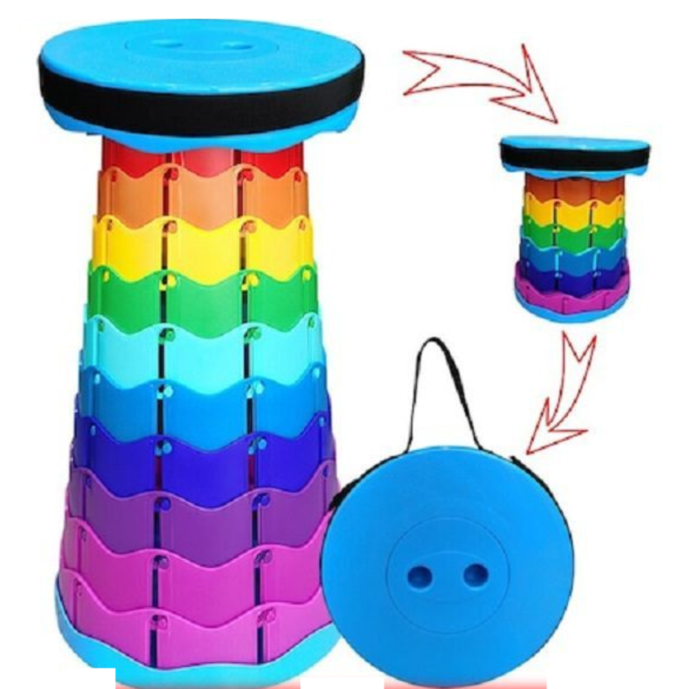 Scaun portabil rotund, pliabil și extensibil, cu mecanism telescopic, ideal pentru camping