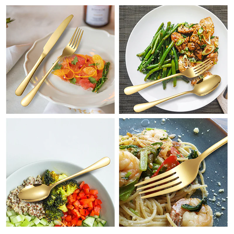 Furculițele sunt realizate cu vârfuri rezistente, iar cuțitele au zimți fini pentru tăiere ușoară. Manerele au un design conic subțire, de culoare verde smarald, care contrastează cu capetele de aur lucios, aducând un aer sofisticat meselor.